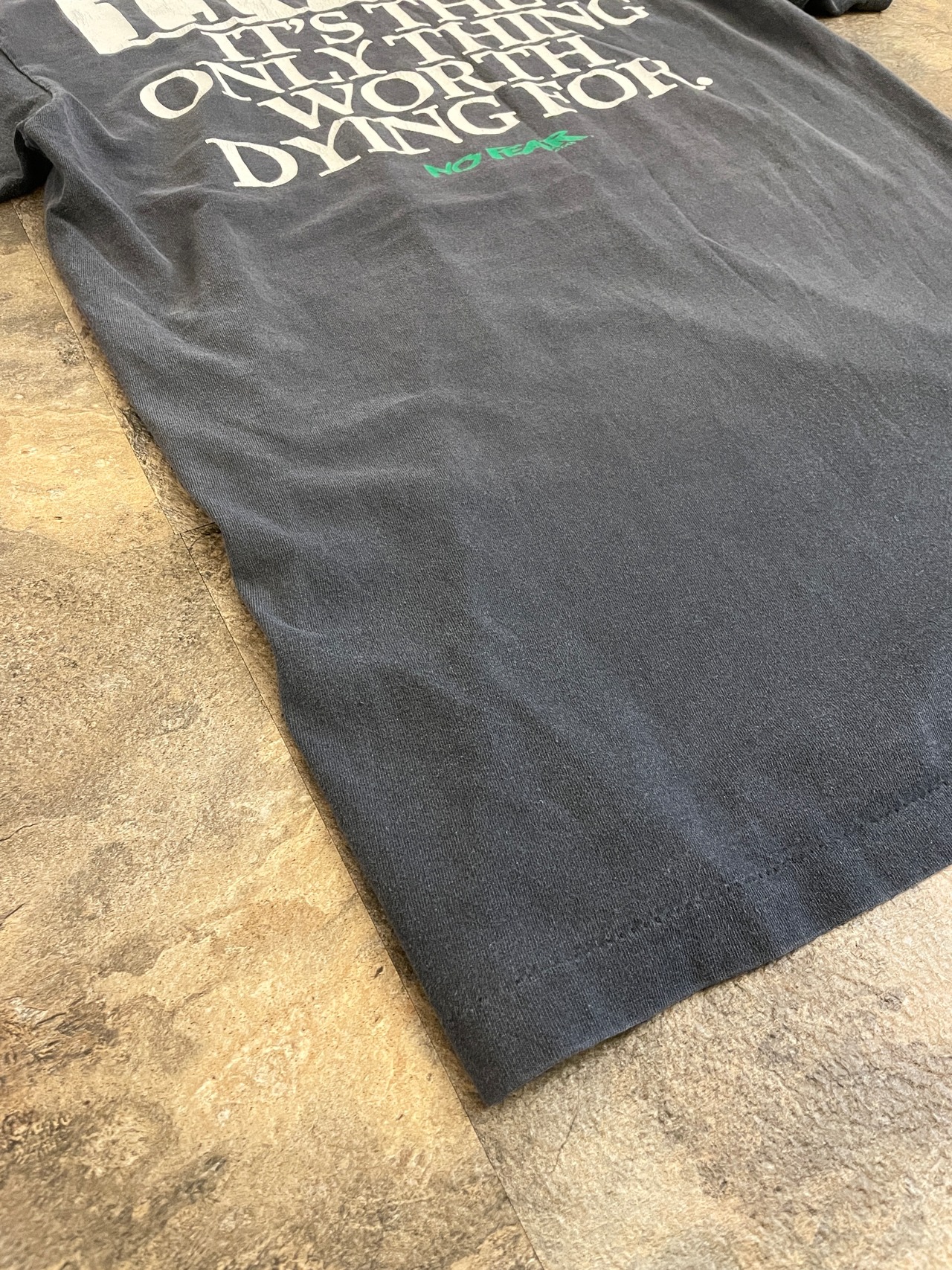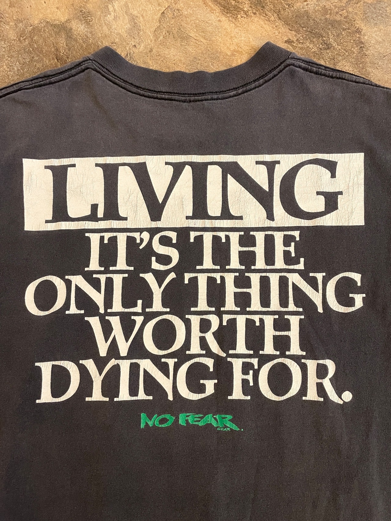 Tシャツに書かれている「LIVING IT'S THE ONLY THING WORTH DYING FOR. NO FEAR.」というメッセージは、まさにこのブランドの精神を象徴するもの。