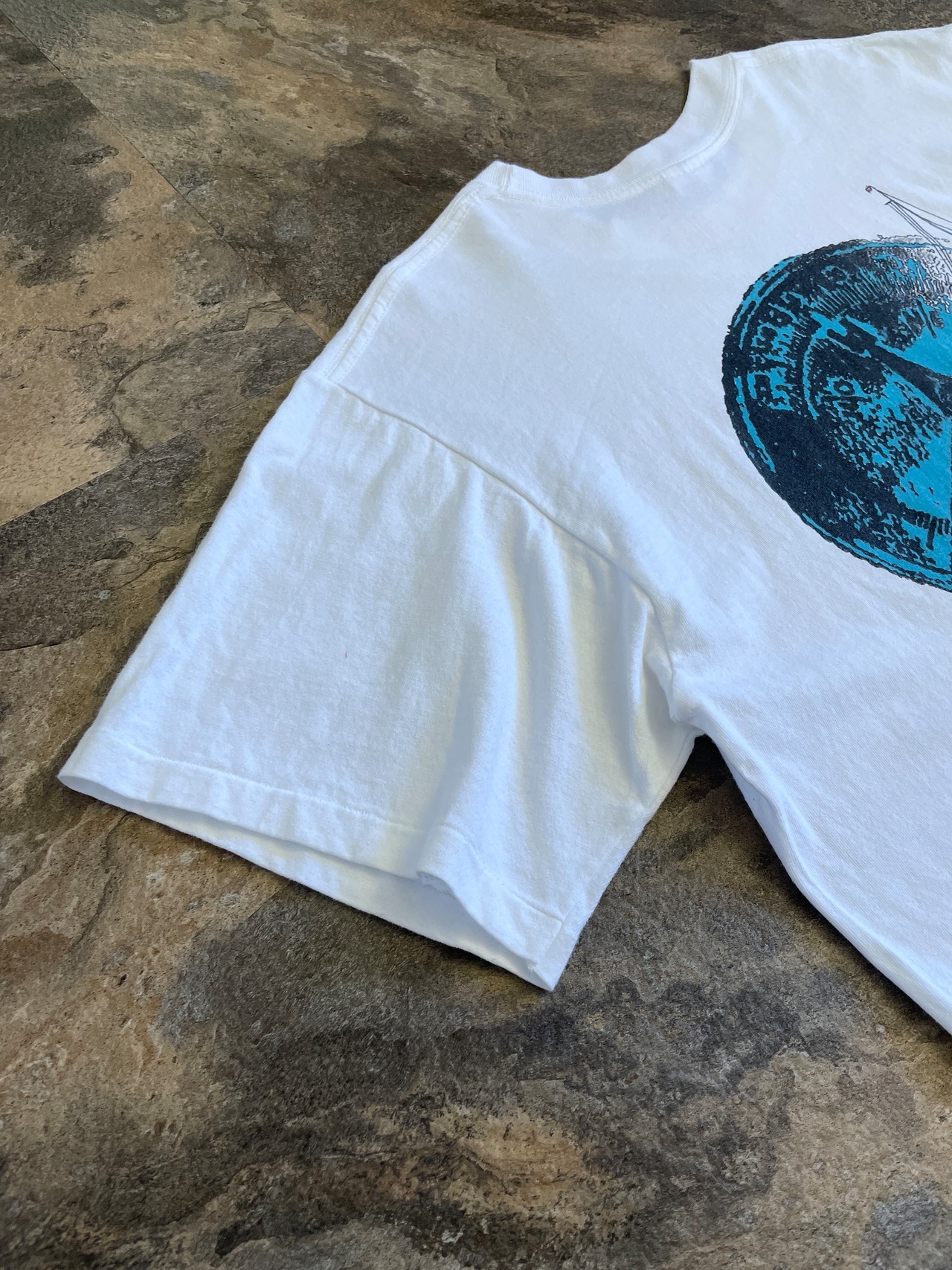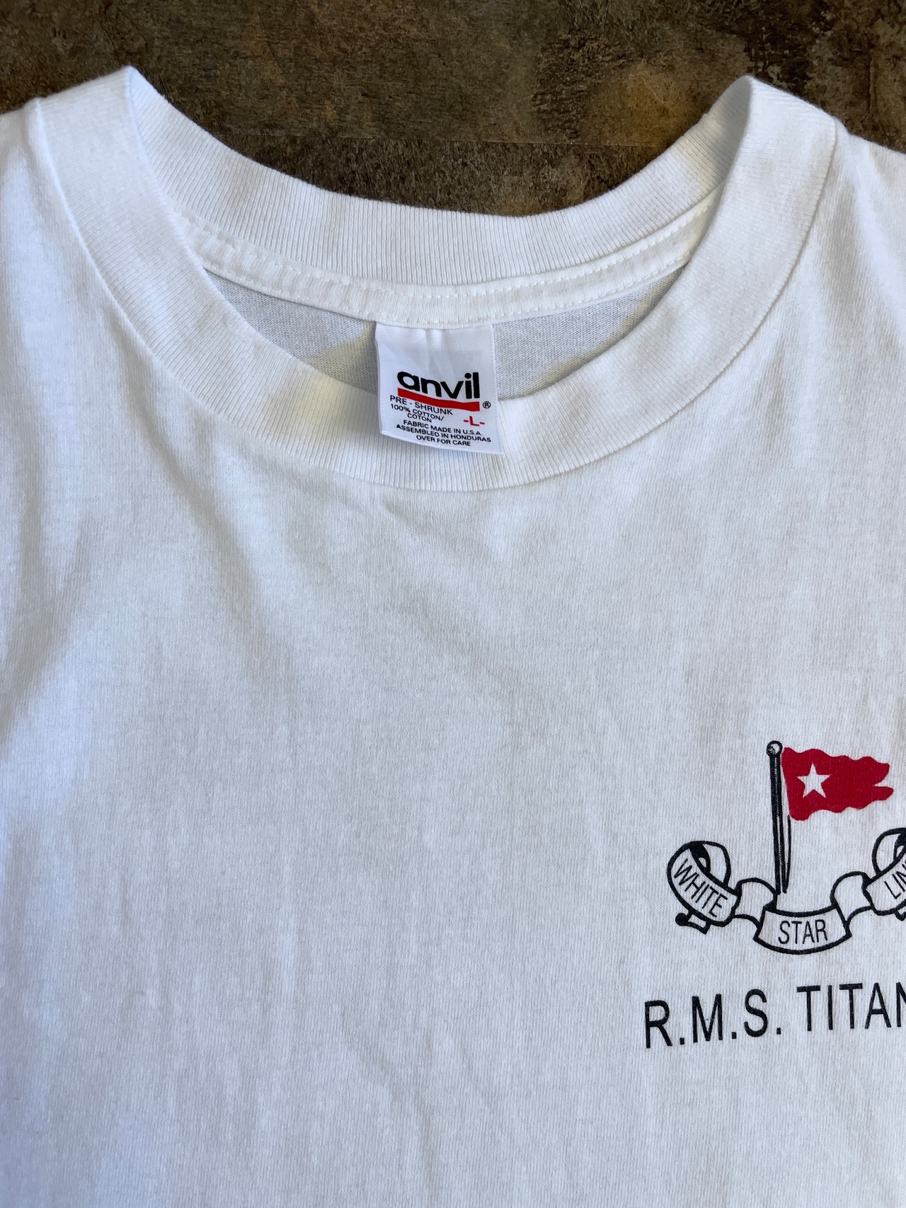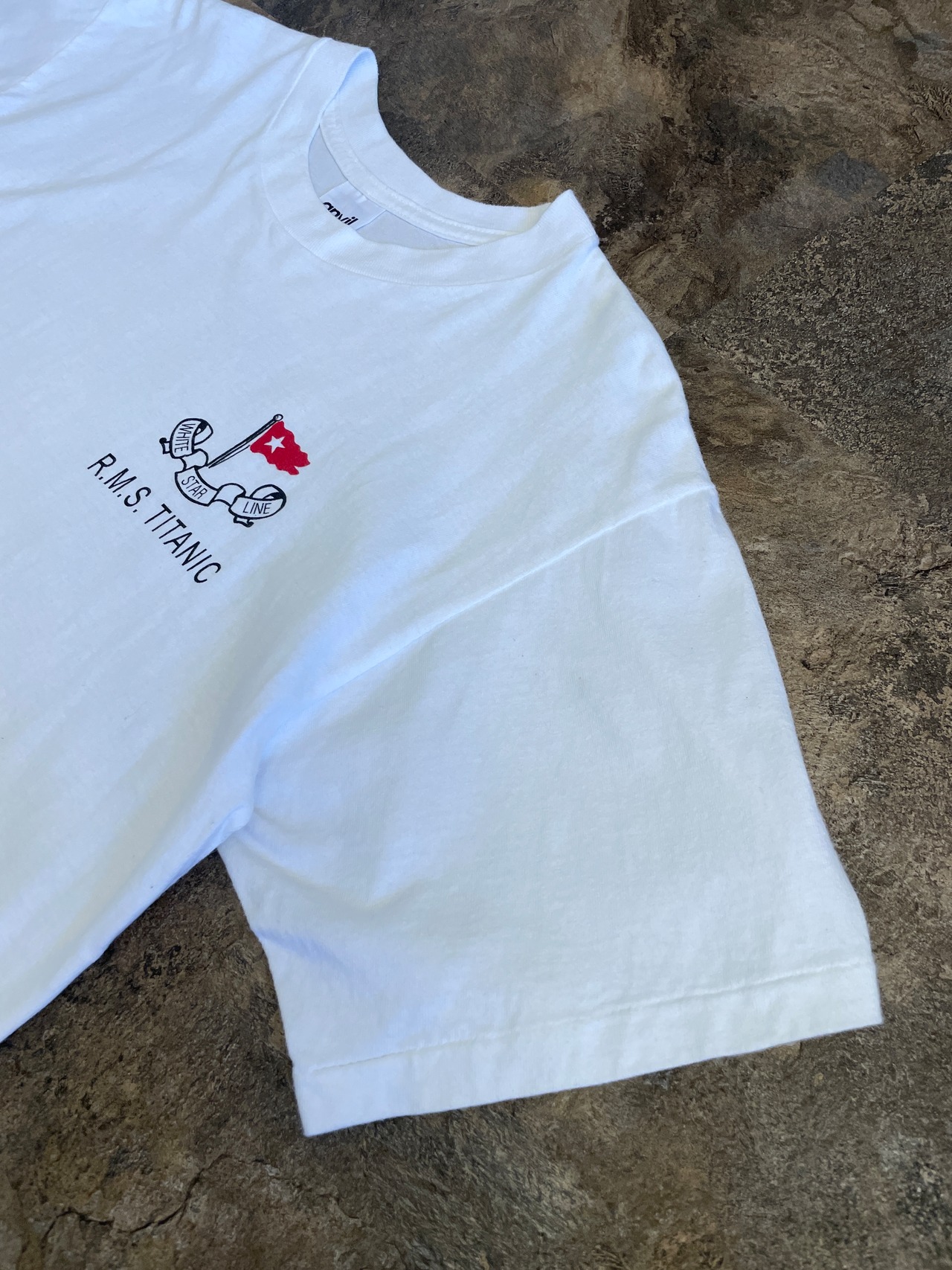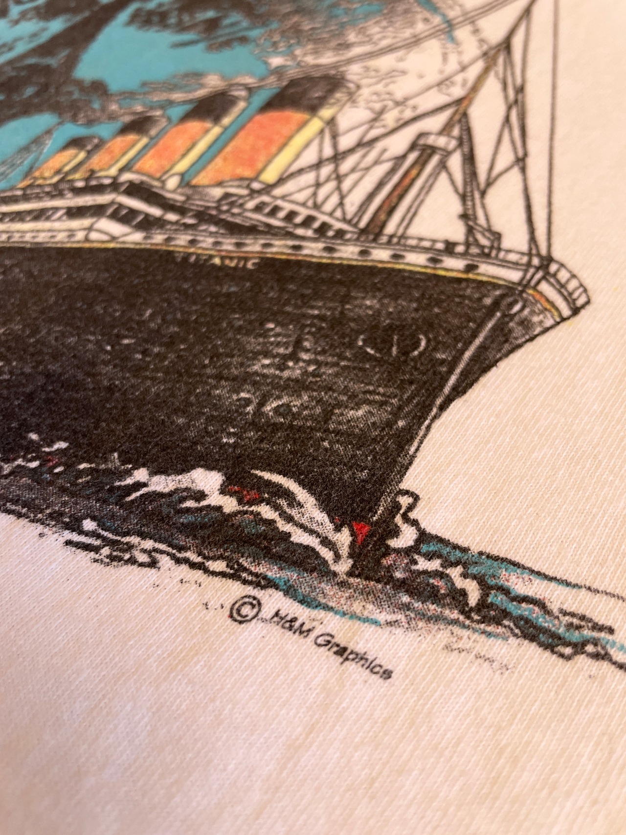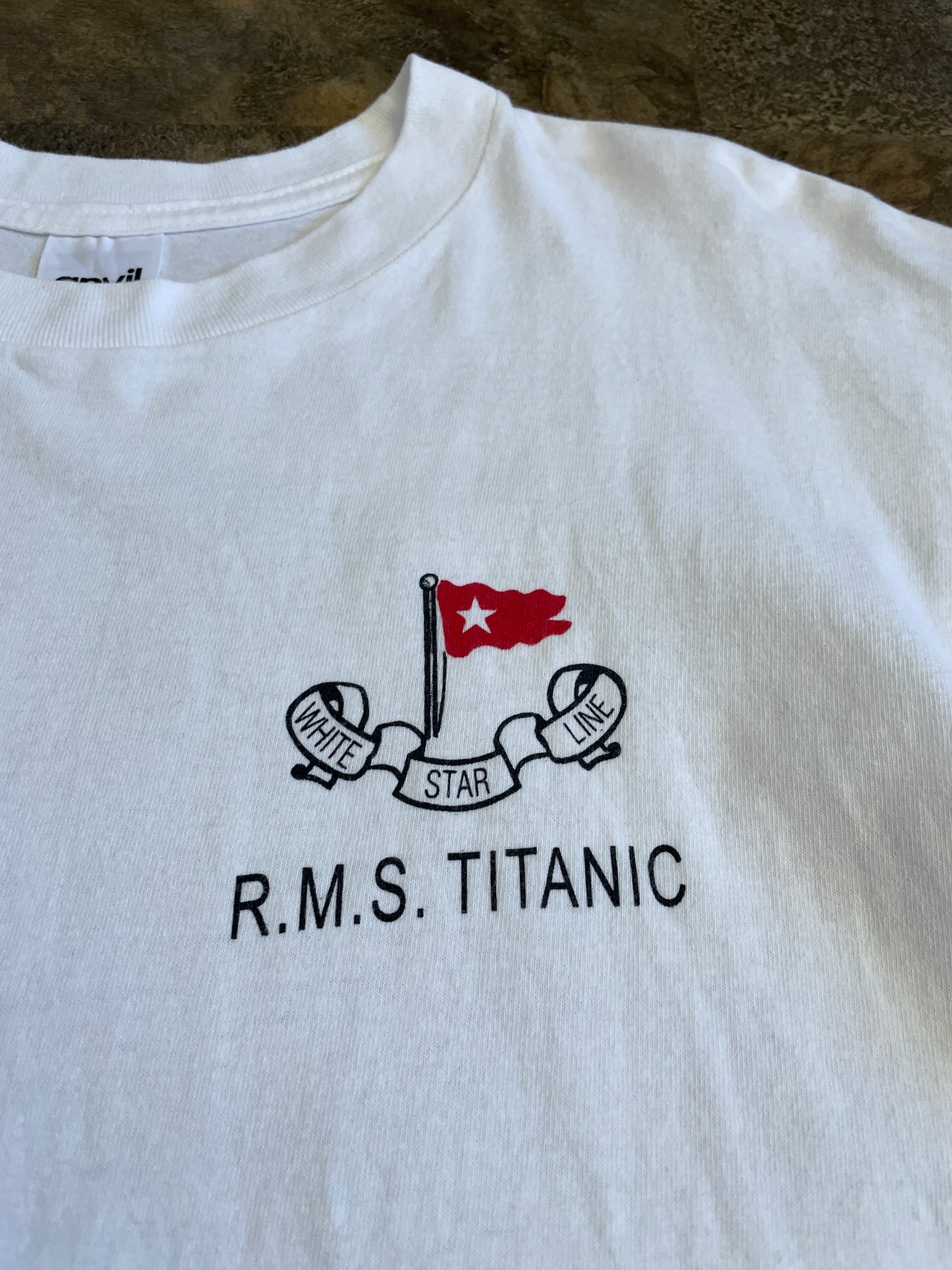 Tシャツには、タイタニック号と羅針盤のようなデザインが描かれています。