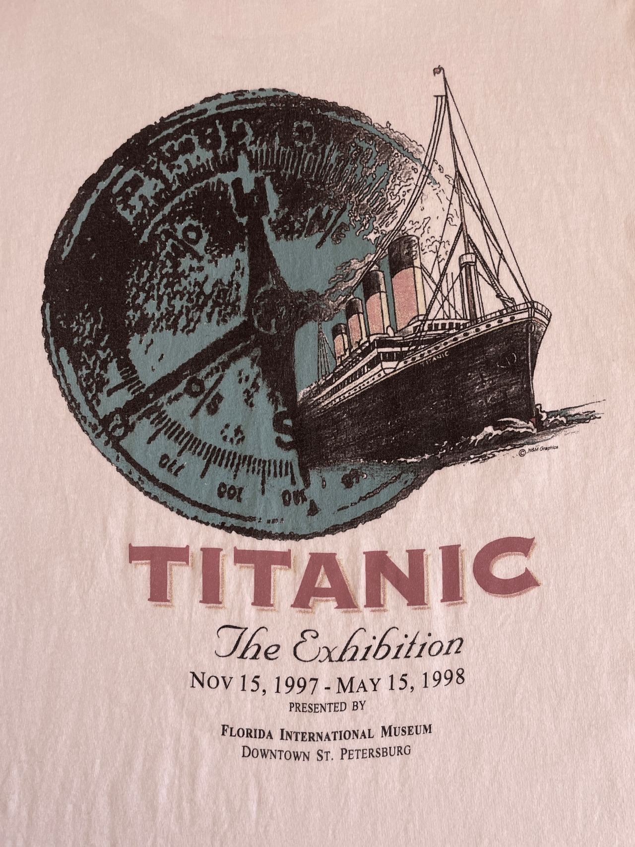 1997年から1998年にかけてフロリダ州セントピーターズバーグのフロリダ国際博物館で開催された「タイタニック展」のTシャツ。