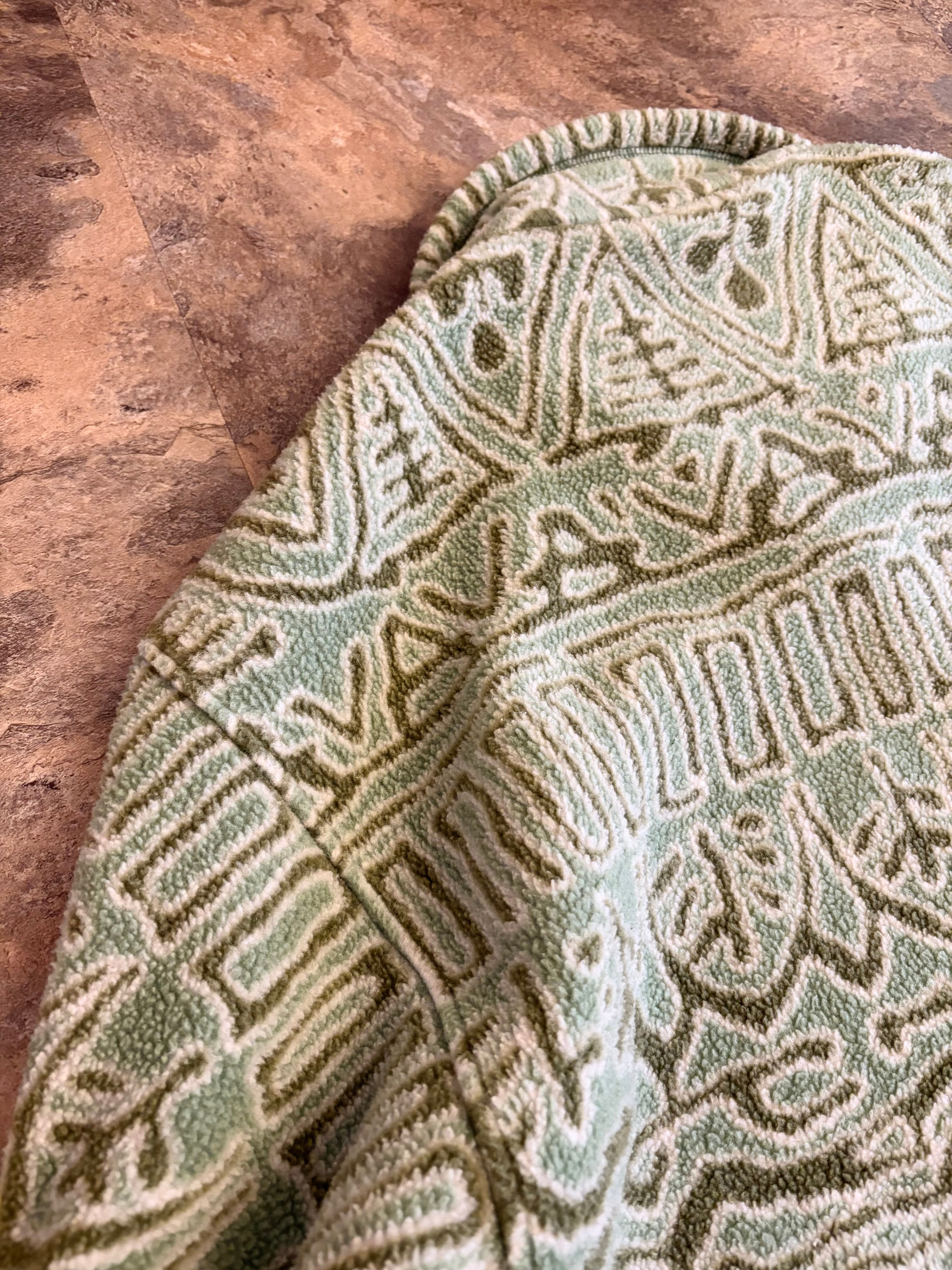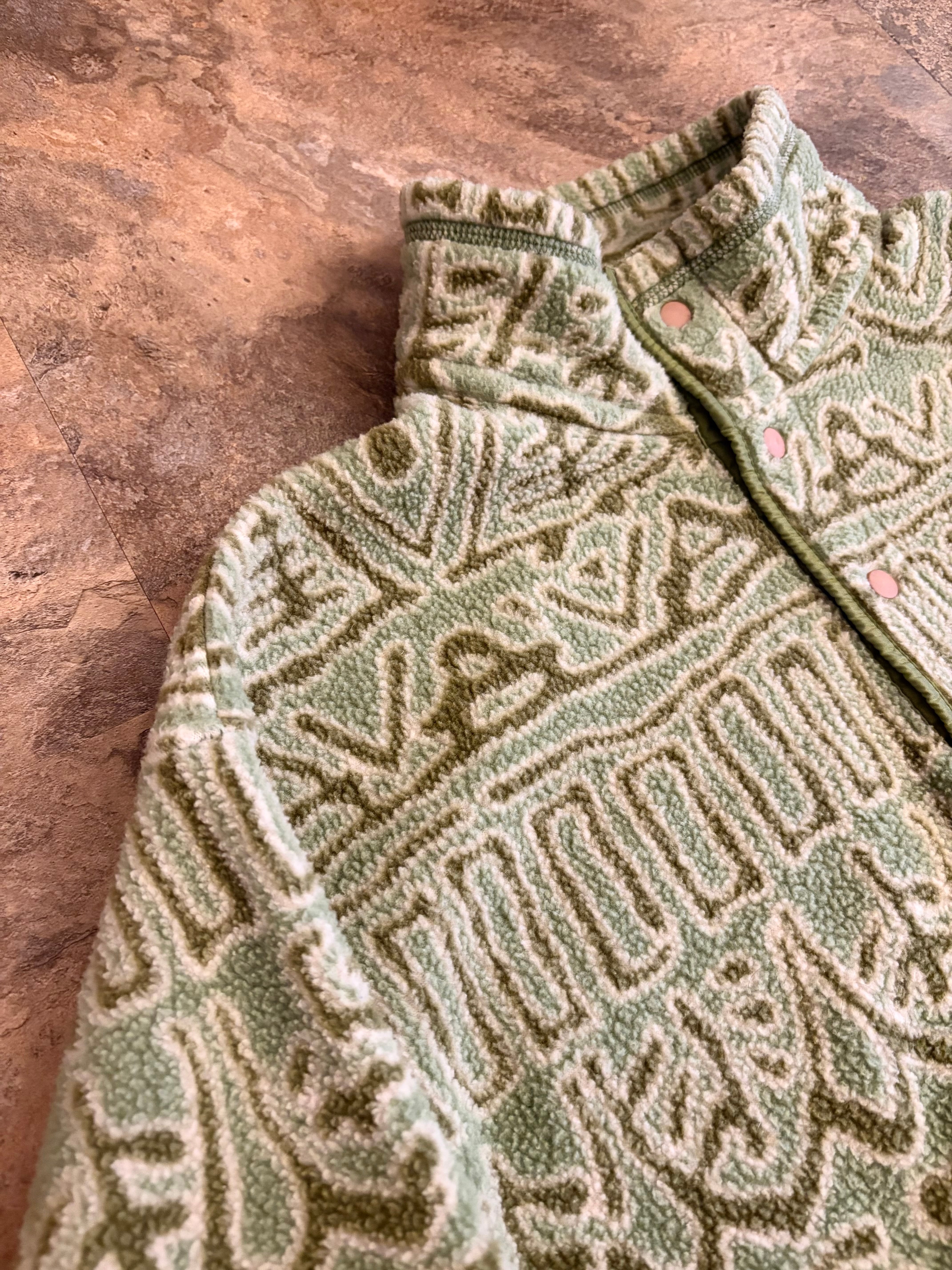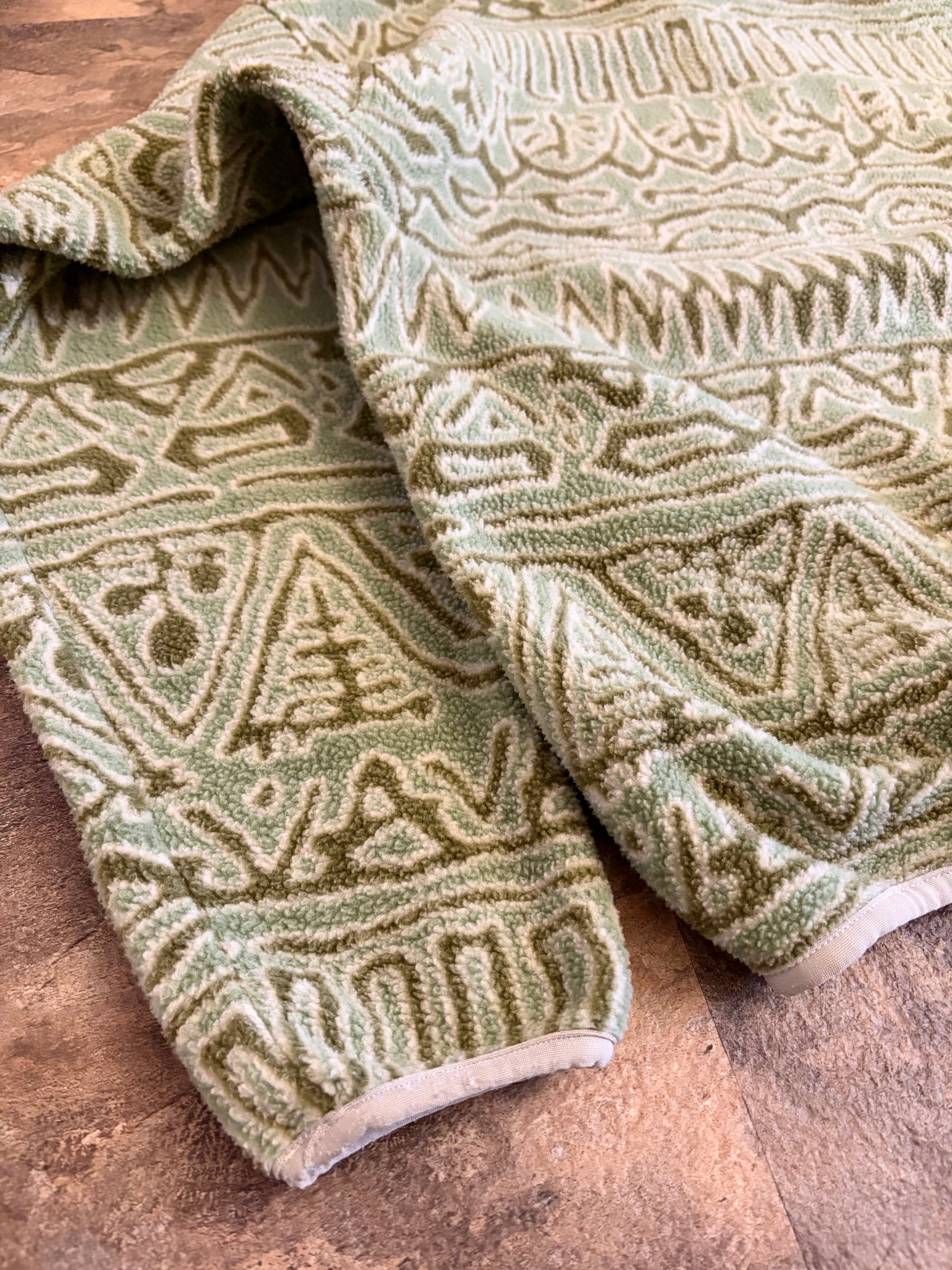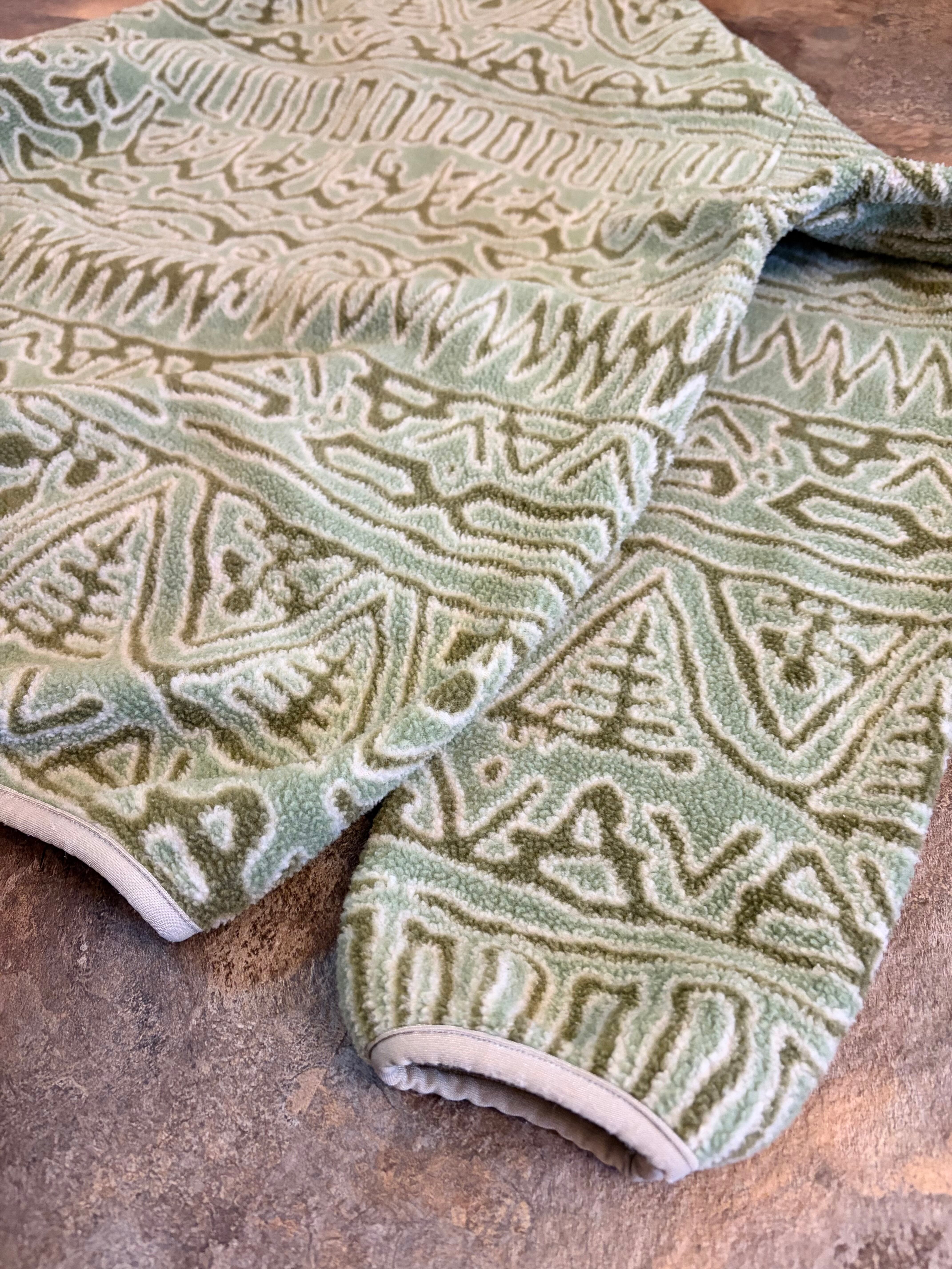 幾何学模様のベージュグリーンフリースジャケット、ハーフジップスタイルで快適な着心地です。