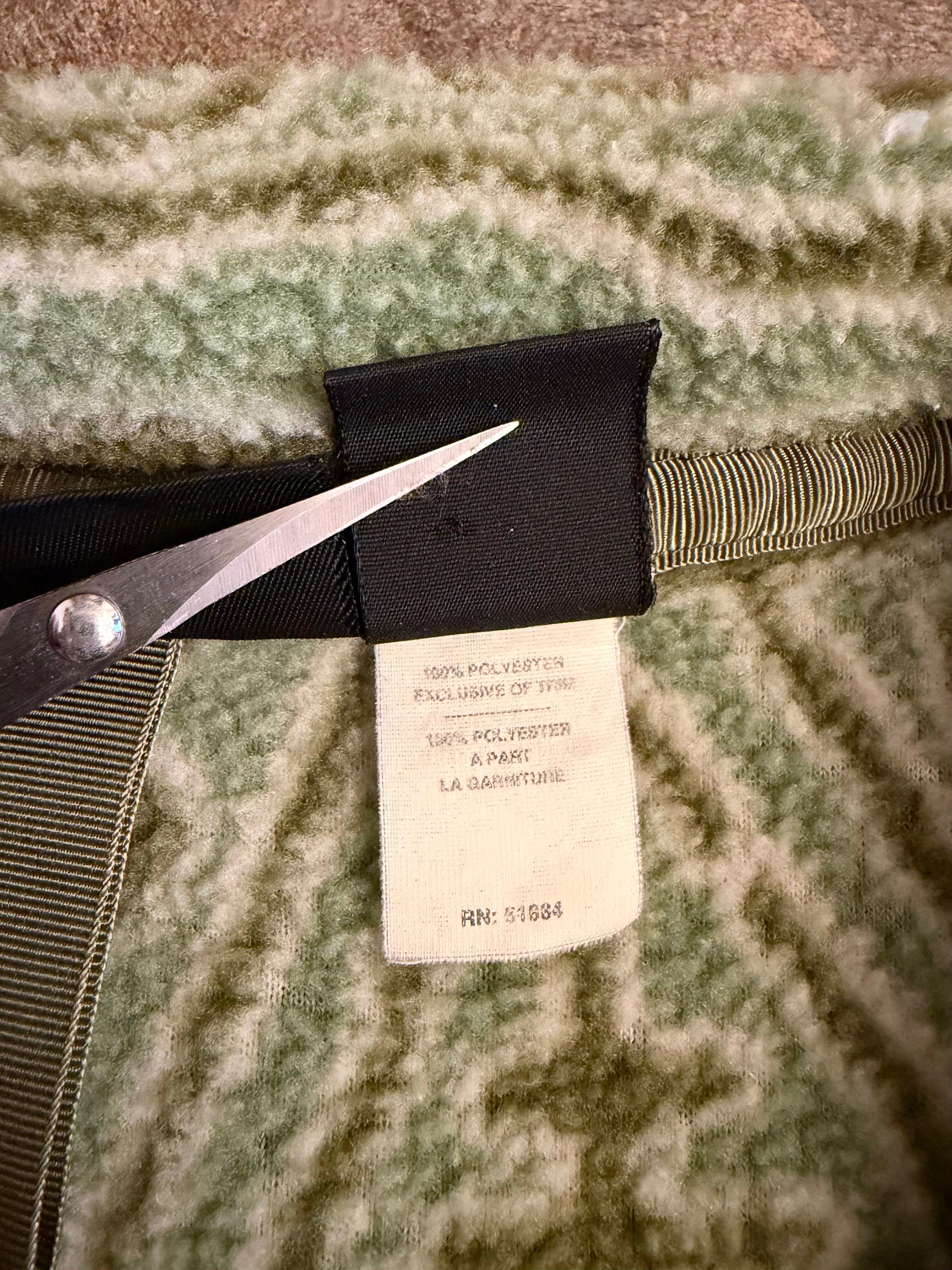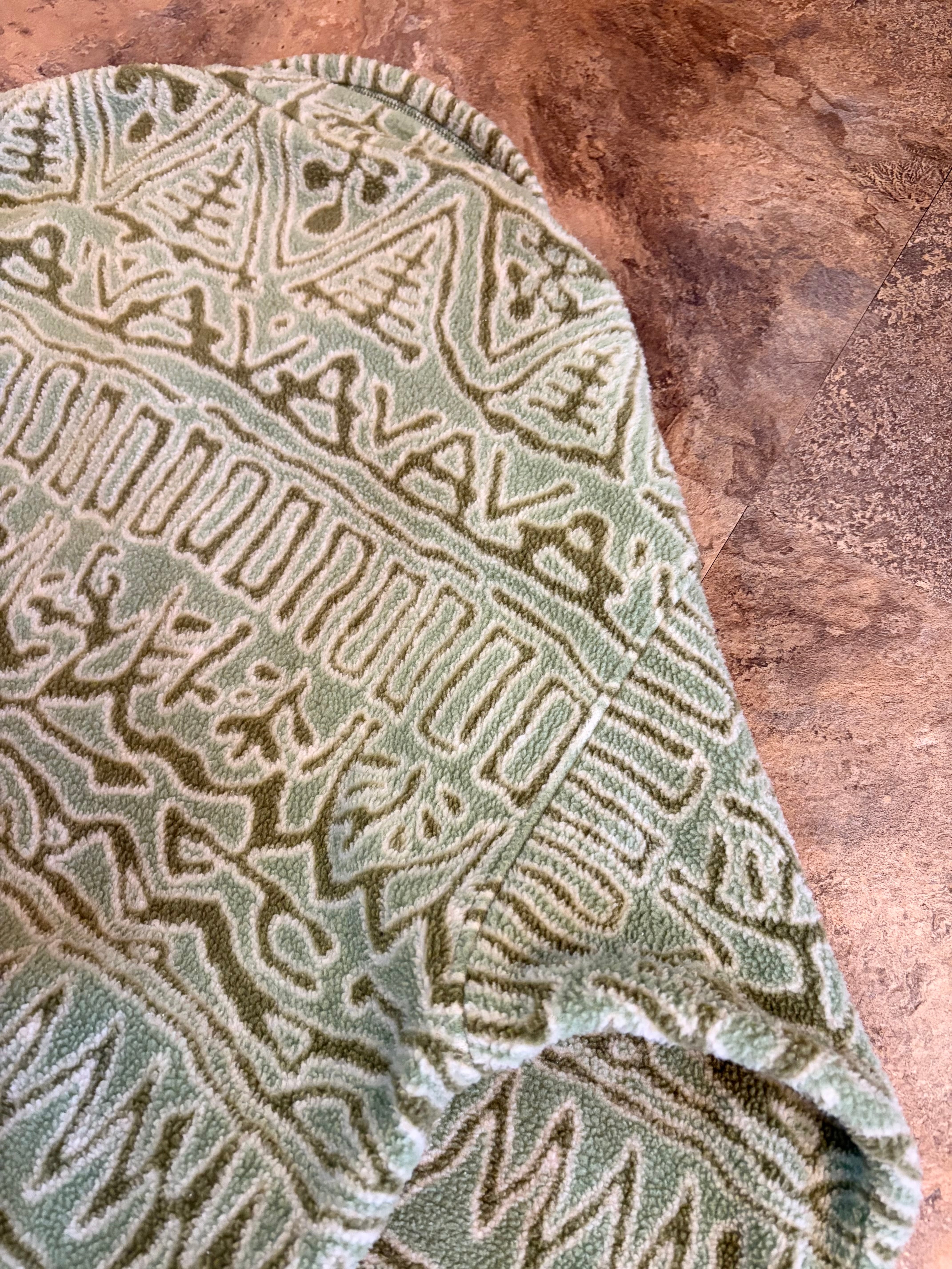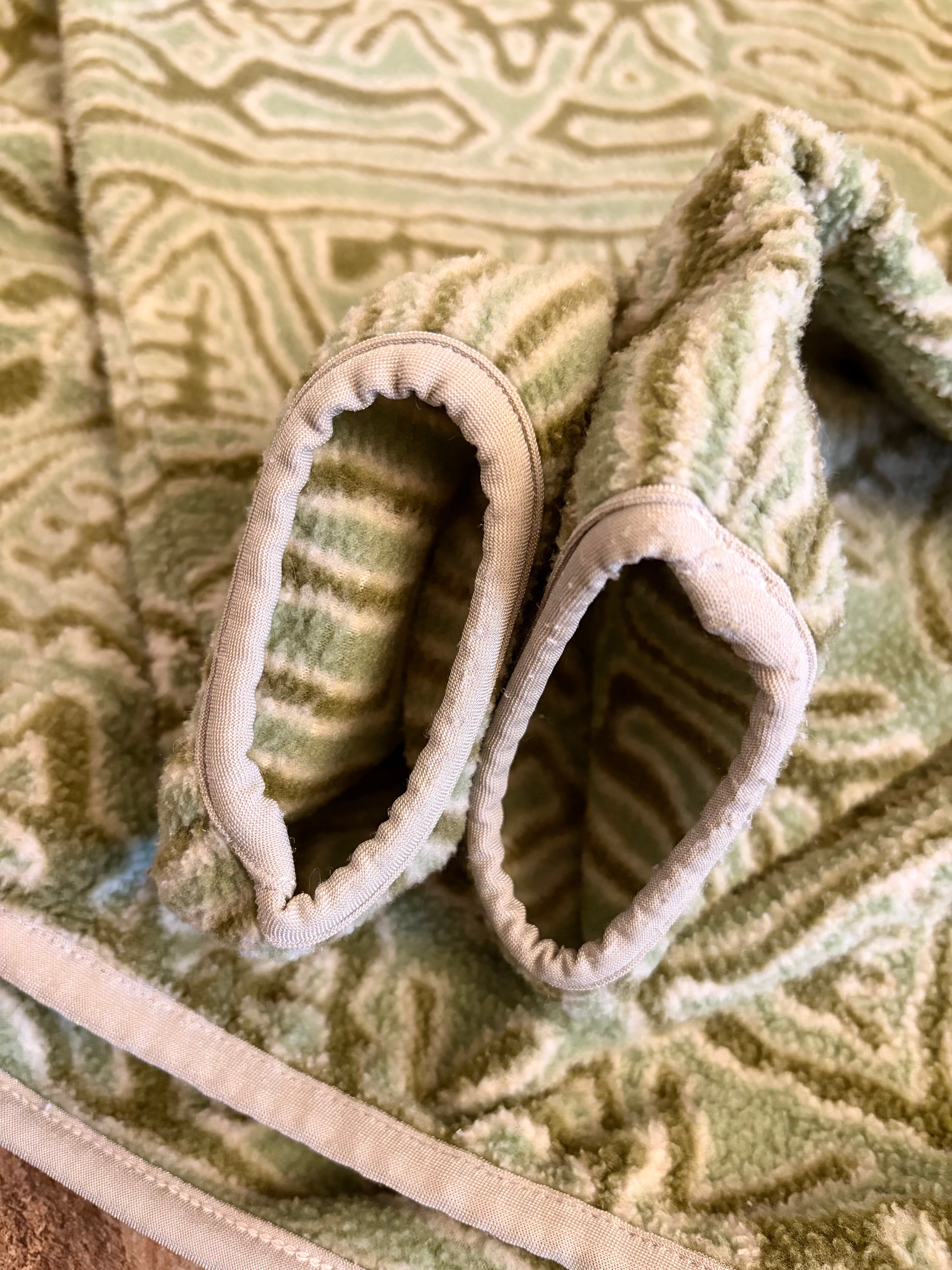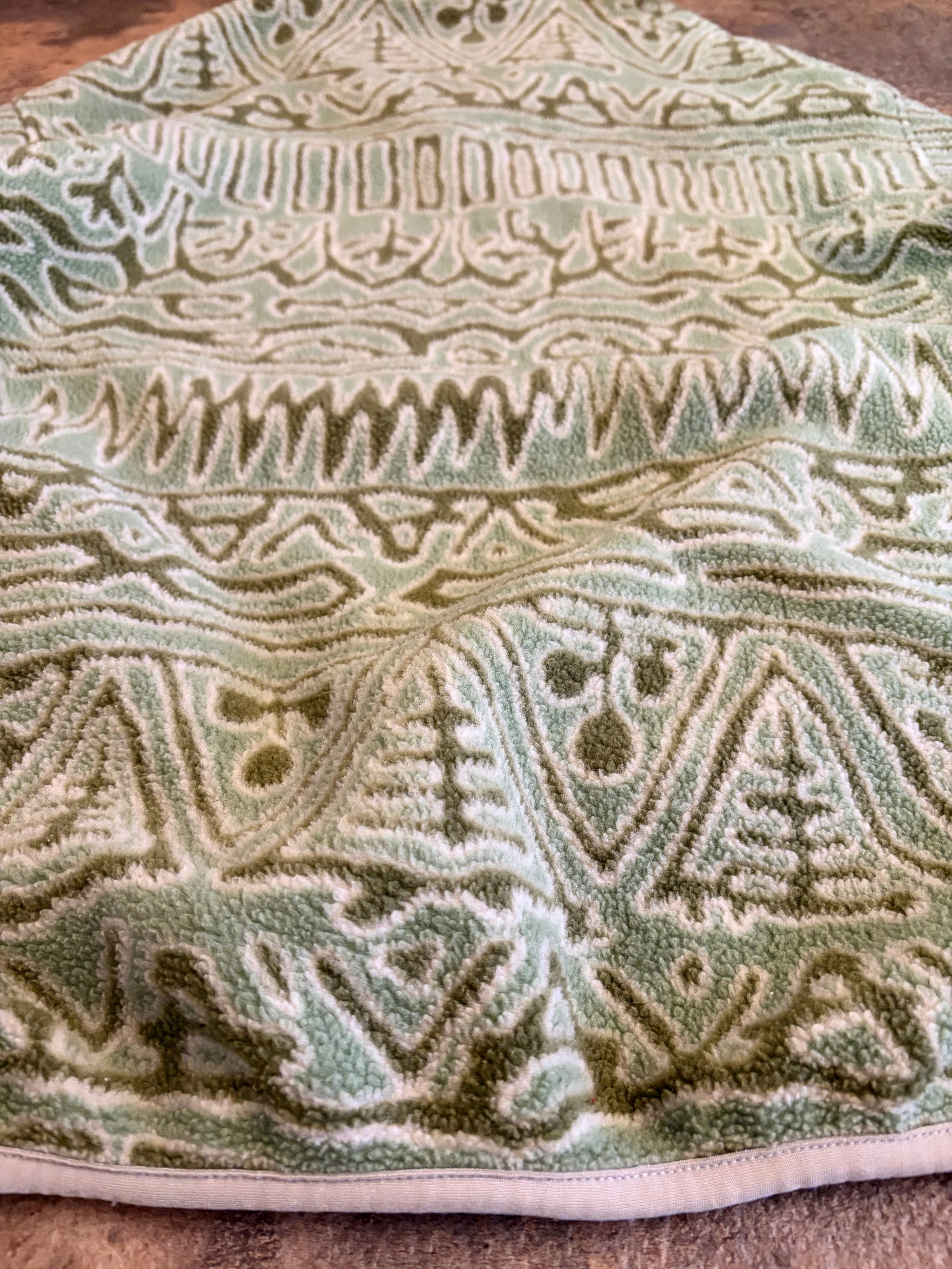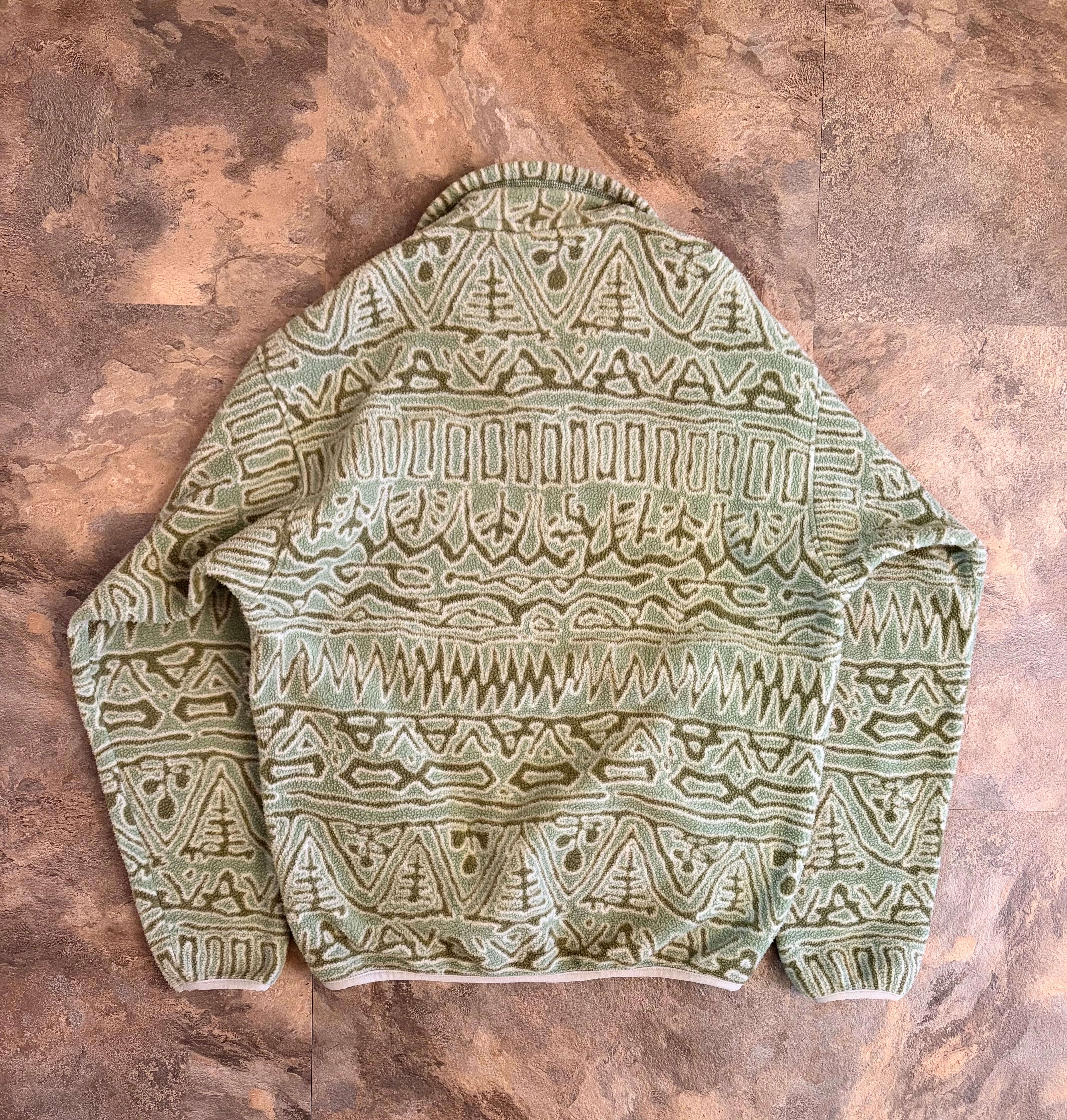 幾何学模様のベージュグリーンフリースジャケット、ハーフジップスタイルで快適な着心地です。