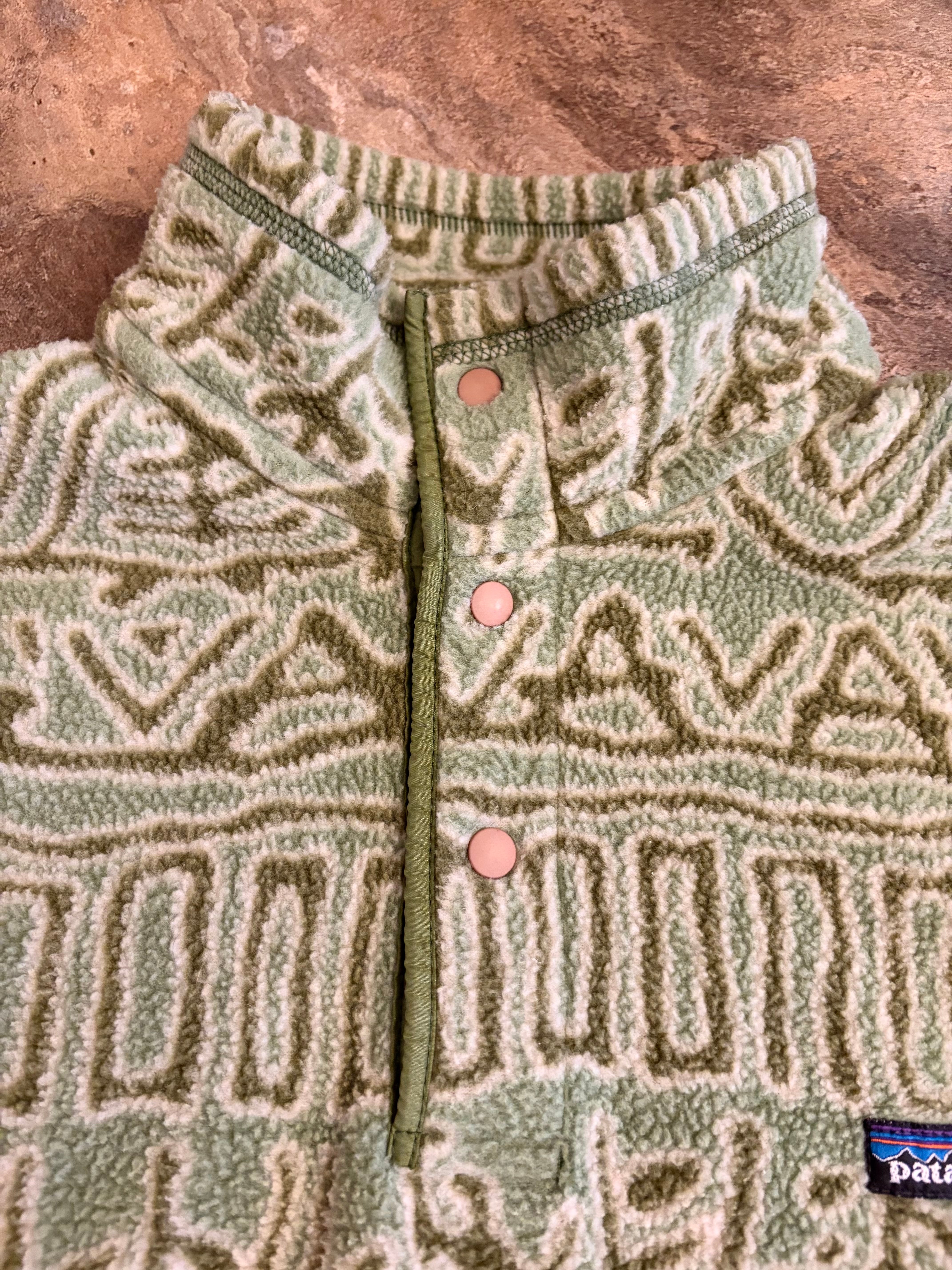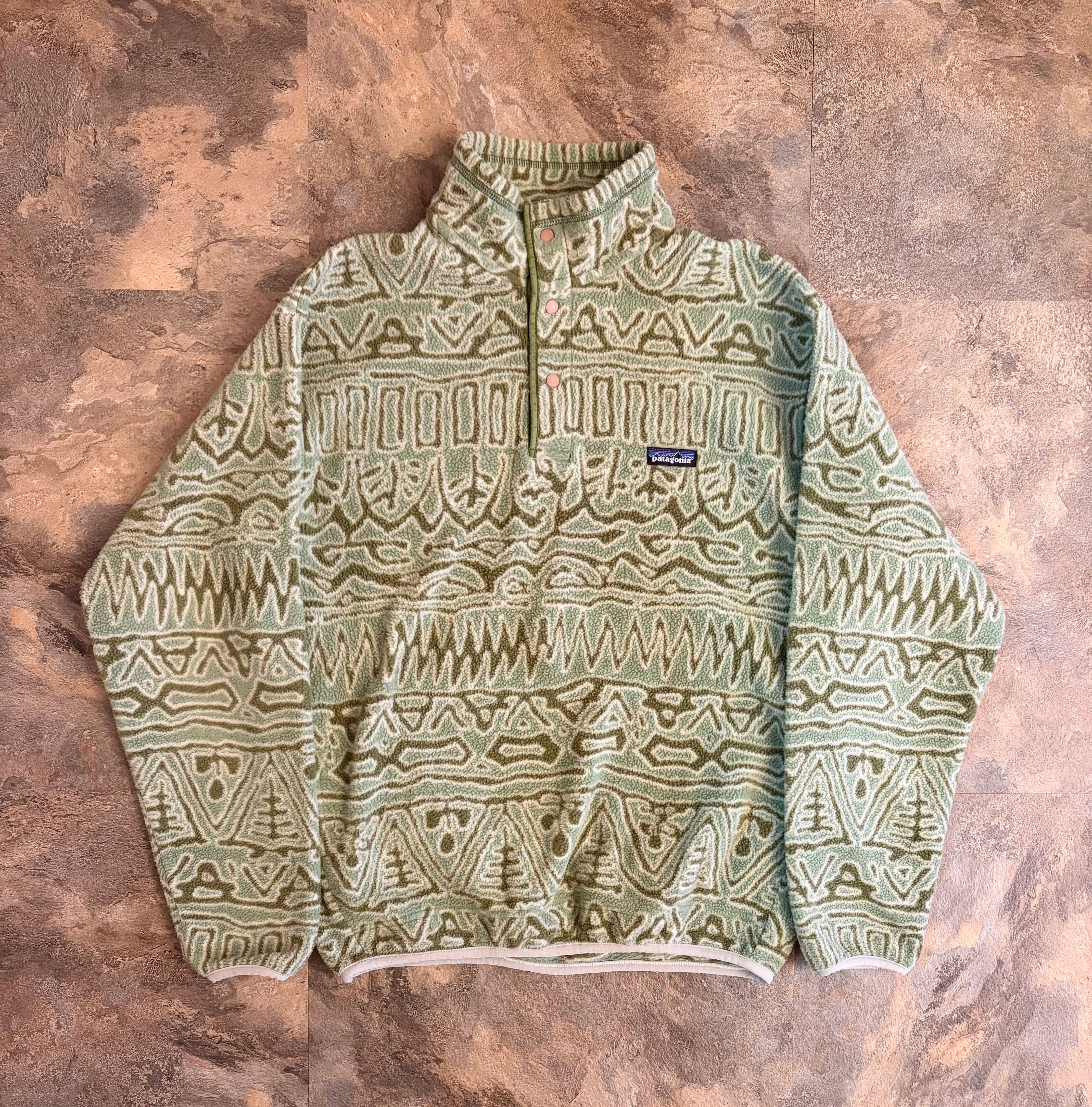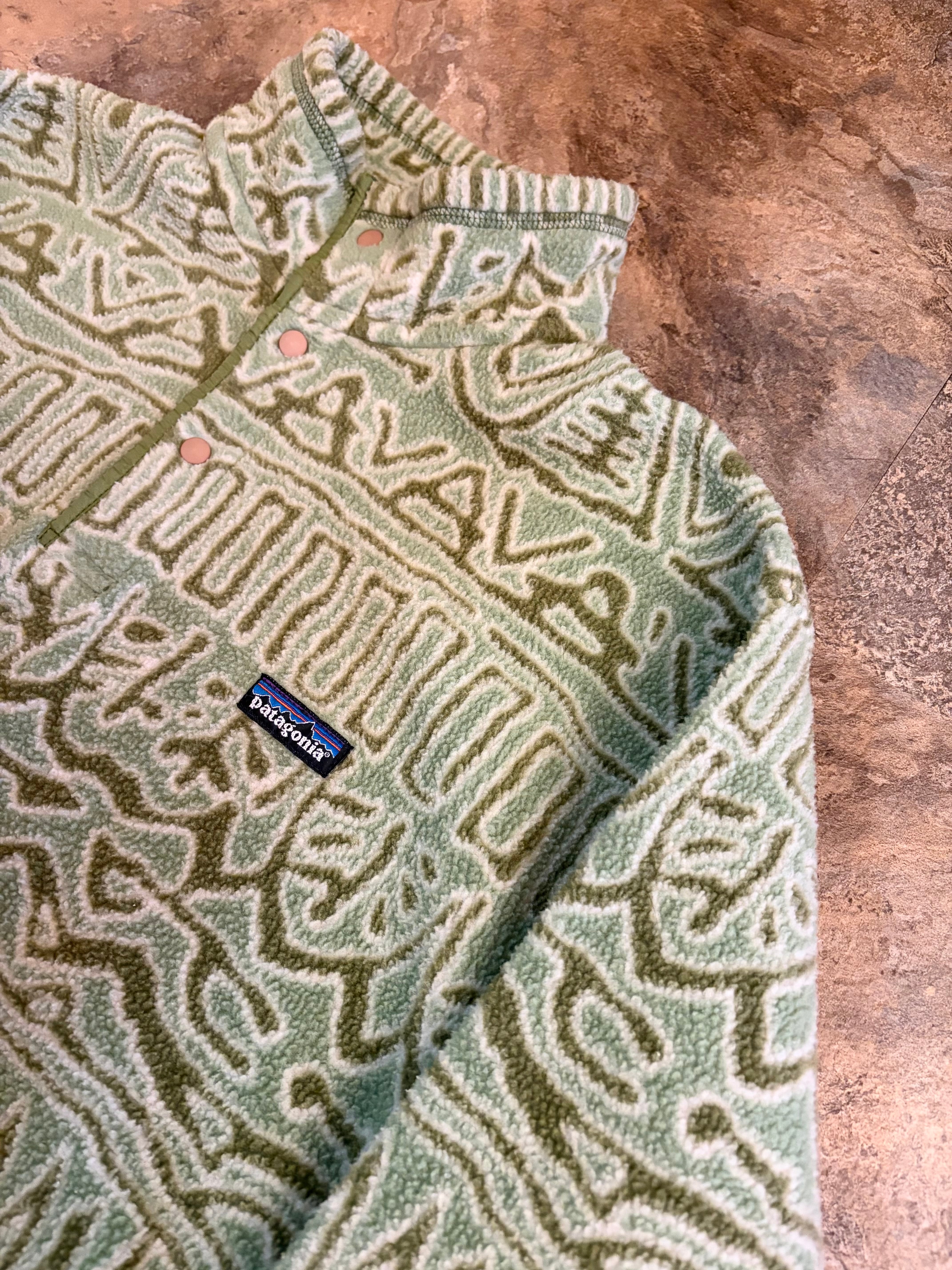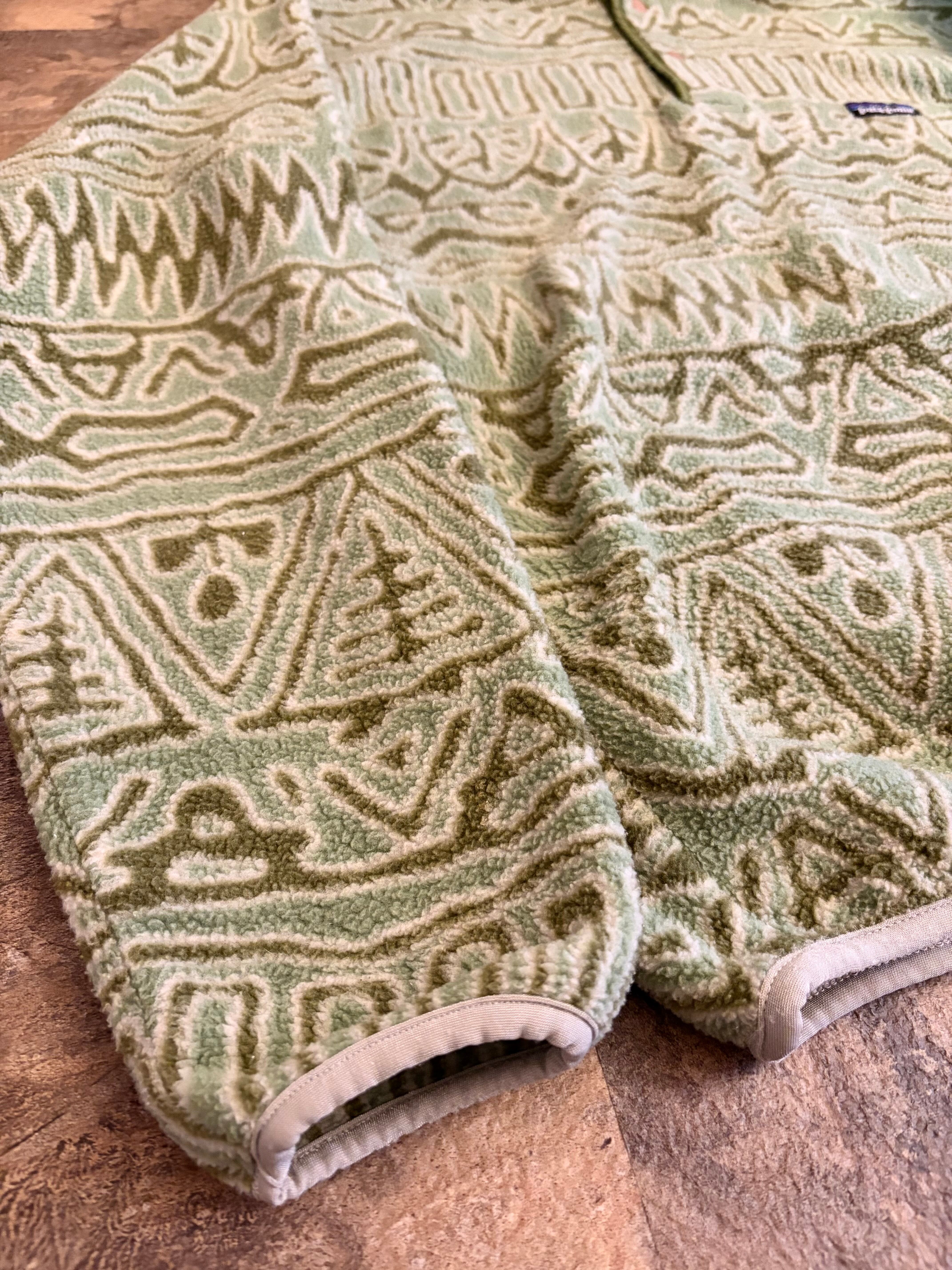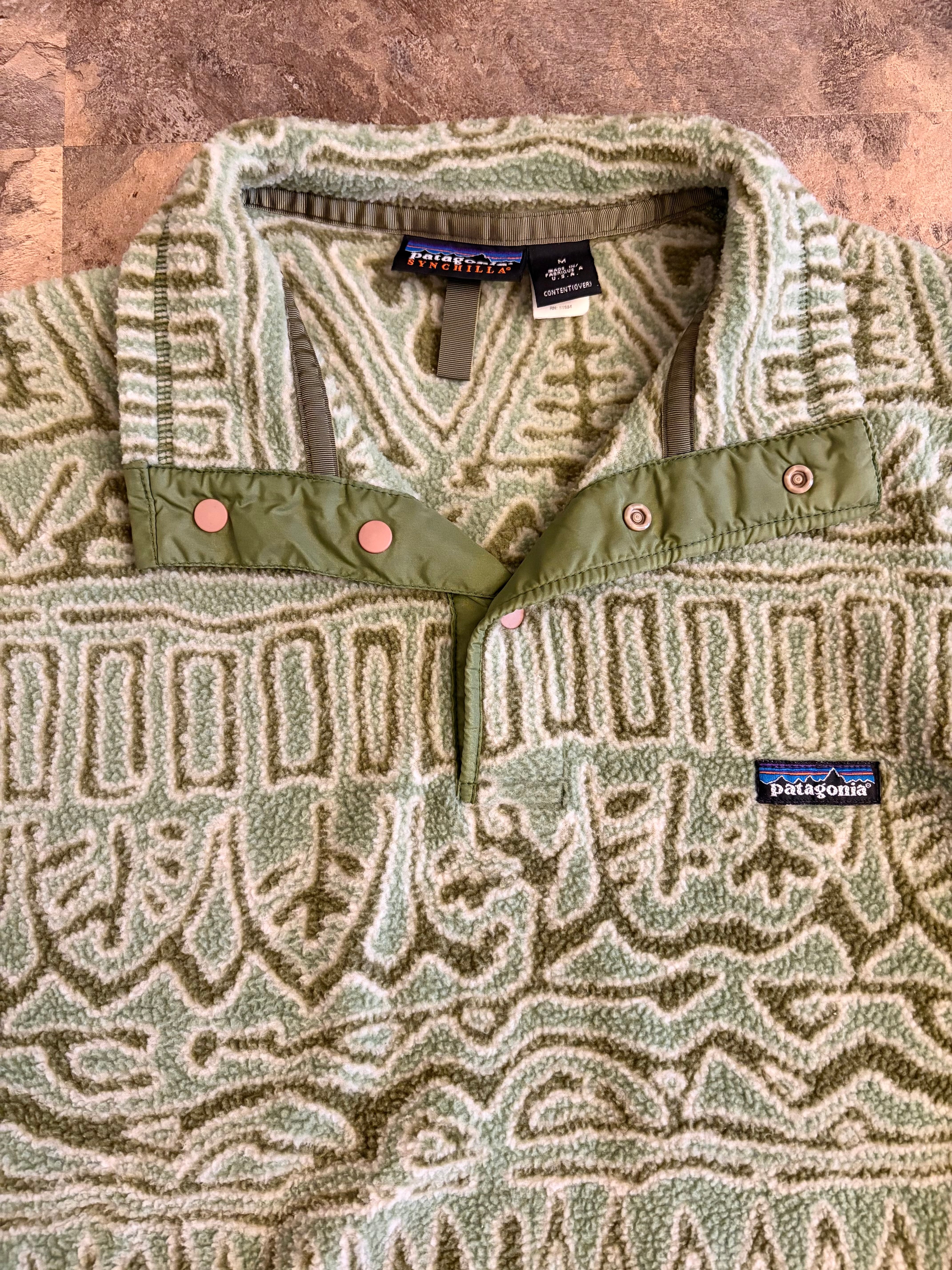 パタゴニア 1990年代 アメリカ製 SYNCHILLA snap fleece 総柄 紋様 古代文字 サラサ柄 コンドル柄 マリ柄 ブルズアイ柄