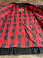 裏地は赤×黒のバッファローチェックネルを貼ったモデルで、袖を捲ったり前を開けて着た時のアクセントが抜群にカッコいい一着。